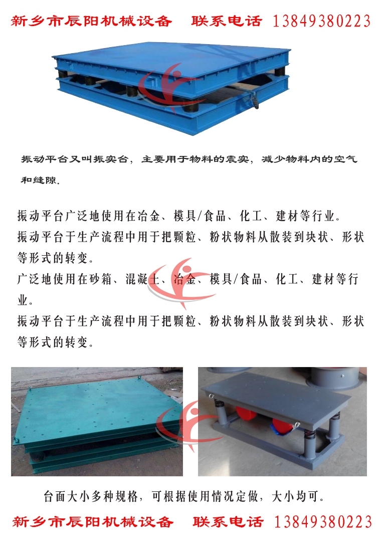 振動平臺又叫振實臺,主要用于物料的振實,減少物料內的空氣和縫隙。振動平臺廣泛使用在預制件、人防工程門、混泥土、消失模、冶...