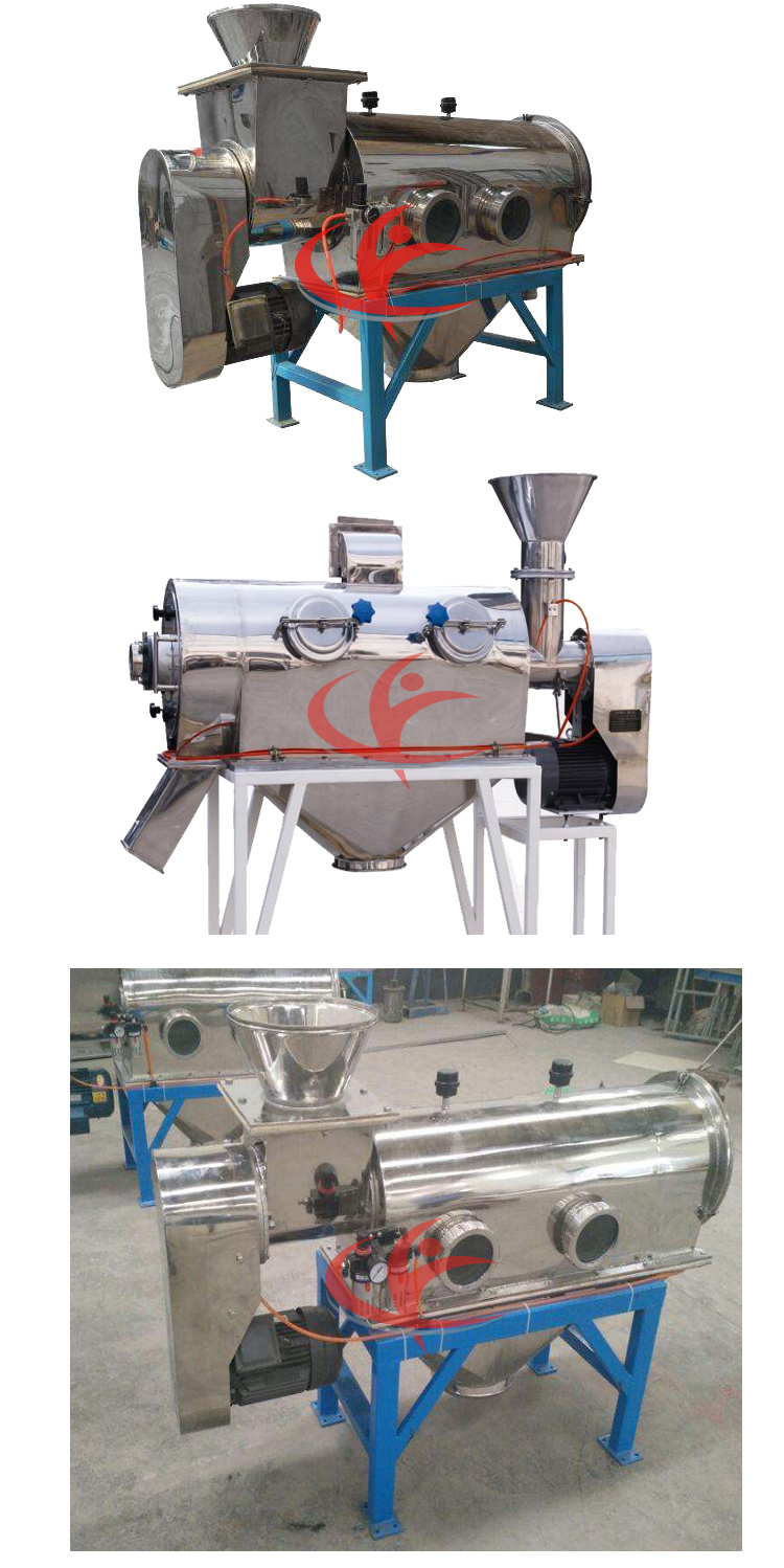 臥式氣流篩網(wǎng)為圓筒狀,置于機體內(nèi),物料通過螺旋輸送系統(tǒng)后,和氣流混合、霧化進(jìn)入網(wǎng)筒內(nèi);通過網(wǎng)筒內(nèi)風(fēng)輪葉片使物料同時受離心力和旋風(fēng)推進(jìn)力,從而近使物料噴射過網(wǎng),由細(xì)料排出口排出,不能過網(wǎng)的物料沿網(wǎng)筒壁從粗料排出口排出。